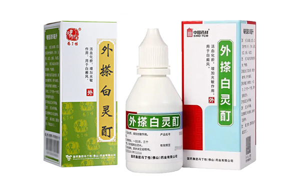 复方卡力孜然酊:是新疆民族开发的一种治疗白癜风的常见外用药,由多种中成药组成,具有舒经、祛风、燥湿、活血、化瘀等作用,能改善白斑部位微循环,增强酪氨酸酶活性,促进黑素合成。